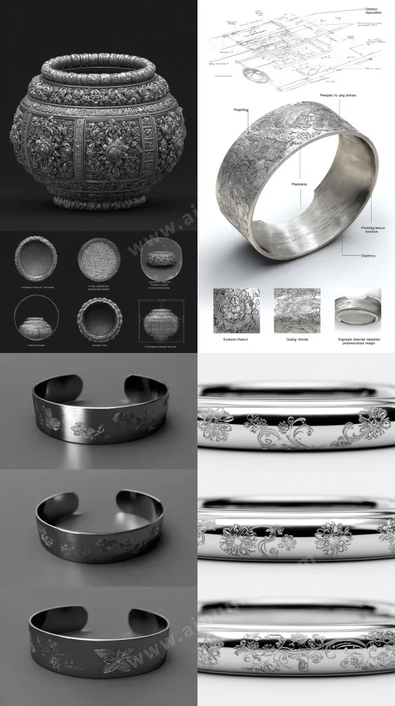 AI Prompt Personalized engraved bracelet design, high-definition final product rendering showcasing the overall shape of the bracelet, made of platinum with intricate floral patterns and inscriptions engraved on the surface. Detailed breakdown illustration showing the bracelet's opening design, engraving craftsmanship details, and precision of metal bending. Polished surface of the bracelet reflects light, with detailed display of each engraving pattern's fineness. --ar 9:16 --c 50 中文大意:个性化的雕刻手环设计,高清最终产品渲染展示手环的整体形状,由铂金制成,表面刻有复杂的花卉图案和铭文。详细的分解插图展示了手链的开口设计、雕刻工艺细节以及金属弯曲的精确度。手镯的抛光表面反射光线,详细显示每个雕刻图案的精细度。 --ar 9:16 --c50 查看更多手工/工艺品/商品 |