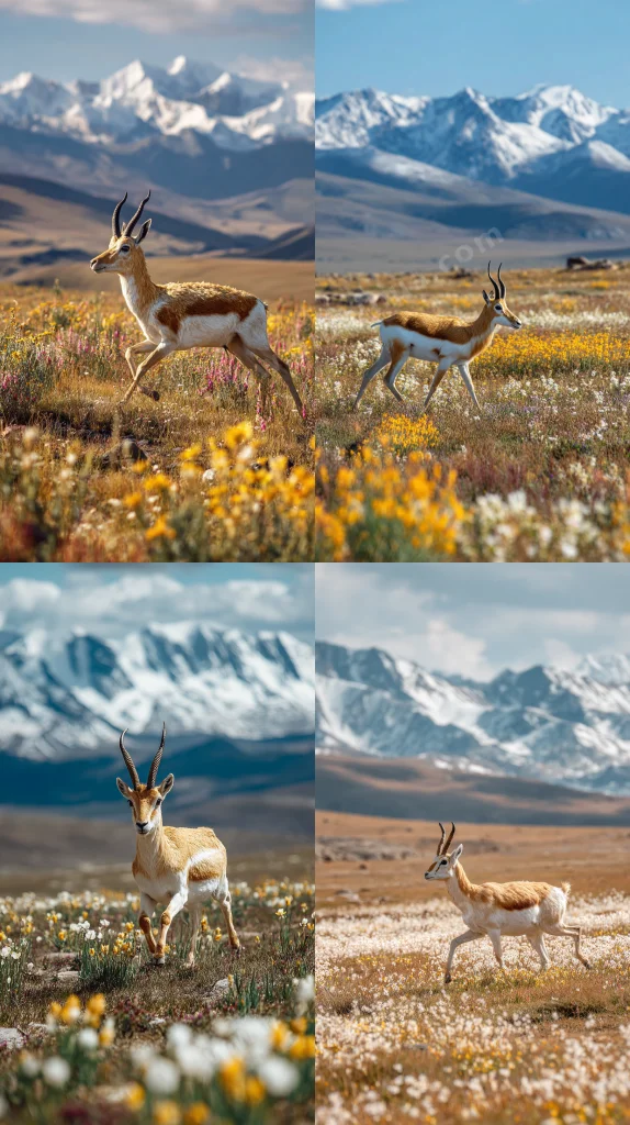 AI Prompt The Tibetan antelope prancing on the alpine meadow has light limbs, light gold fur, and clear eyes. The surrounding plateau wildflowers, distant snowy peaks and blue skies constitute its ecological environment, showing the purity and agility of the plateau. A realistic photography style with natural light --ar 9:16 中文大意:在高山草甸上腾跃的藏羚羊,四肢轻捷,毛色浅金,眼神清澈。周围高原野花、远处雪峰与湛蓝天空构成它的生态环境,展现出高原的纯净与灵动。具有自然光线的真实摄影风格 --ar 9:16 查看更多动物/植物/美食 |