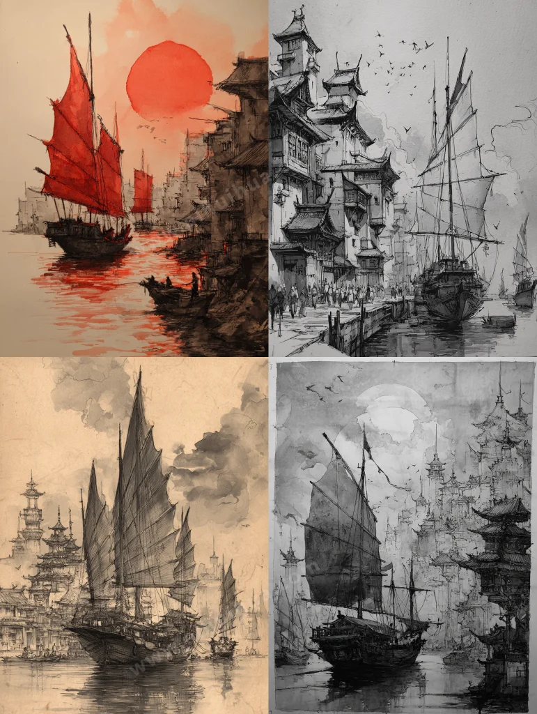 中文大意:一幅丁克夫森风格的水墨画,错综复杂的线条与富有表现力的对比,一艘中国垃圾船驶入东南亚中世纪港口的水墨素描,日落 --ar 3:4