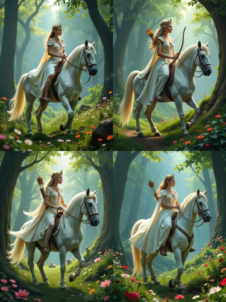 AI Prompt In the magical elf world, a queen wearing a white dress, carrying a bow and arrow, and wearing a crown, gracefully riding on a white horse, looking intently into the distance. The background is a lush forest and flowers and small animals., mysterious, panoramic view --ar 3:4 中文大意:魔法精灵世界中,一位穿着白色连衣裙,背着弓箭,头戴王冠的女王,优雅地骑在白马上,目不转睛地看着远方。背景是郁郁葱葱的森林、鲜花和小动物。神秘的全景 --ar 3:4 查看更多手绘/插画 |
