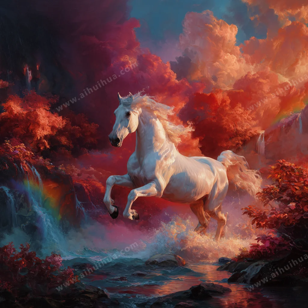 中文大意:在彩虹中跃动的白马,瀑布飞溅的景象中,桂花被彩虹般的光芒温润。一道火红的阴影升起,冲向蔚蓝的天空,构成奇幻而绚丽的场景。