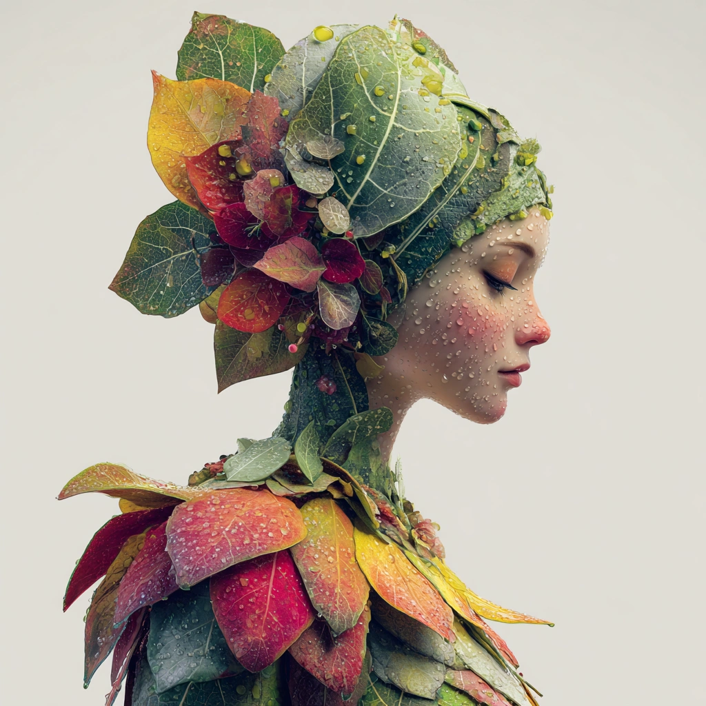提示词(Prompt) 正面树叶精灵IP形象,绿色叶子发型,身着彩色花瓣裙,白色背景,叶脉和花瓣有纹理细节,脸上点缀露珠,色彩清新 |