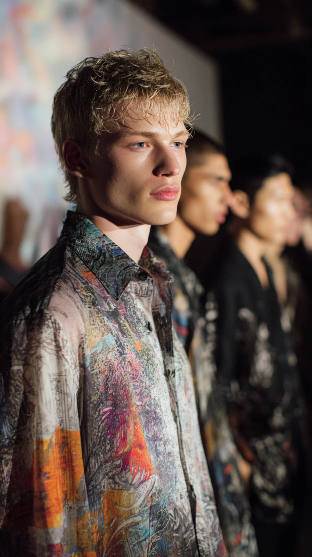 时尚秀场后台,男模特身穿个性印花衬衫,彩色与黑色混搭,先锋潮流风格,印花图案细腻,后台灯光斑驳照射 --ar 9:16
