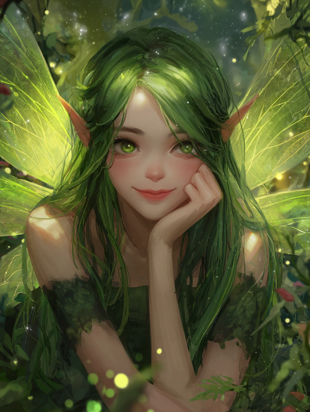 提示词(Prompt) 手绘风格,奇幻魔法,森林精灵,绿色长发,尖耳朵,发光翅膀,温柔微笑,自然元素环绕,童话氛围,IP形象 --ar 3:4 |