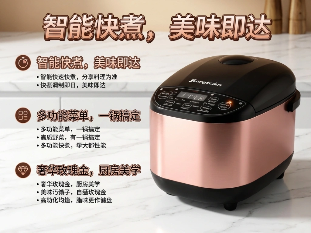 提示词(Prompt) 用中文写这个电饭煲的三个卖点,方便在电商平台销售 --ar 4:5 使用的图片 ![]() |