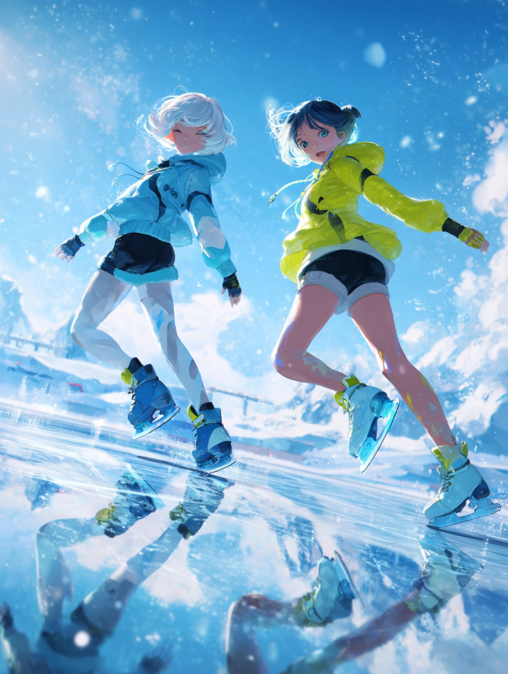 提示词(Prompt) 动漫冬日滑冰场,少女旋转跳跃,雪白与天蓝,运动青春风格,滑冰鞋金属光泽,冰面反射灯光,画面清爽灵动 --ar 3:4 |