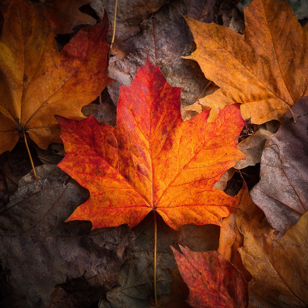 提示词(Prompt) 秋日枫林地面,枫叶特写,橙红与金黄色彩,高清自然摄影风格,叶脉清晰可见,落叶层叠,夕阳余晖照亮叶片,画面温暖治愈 |