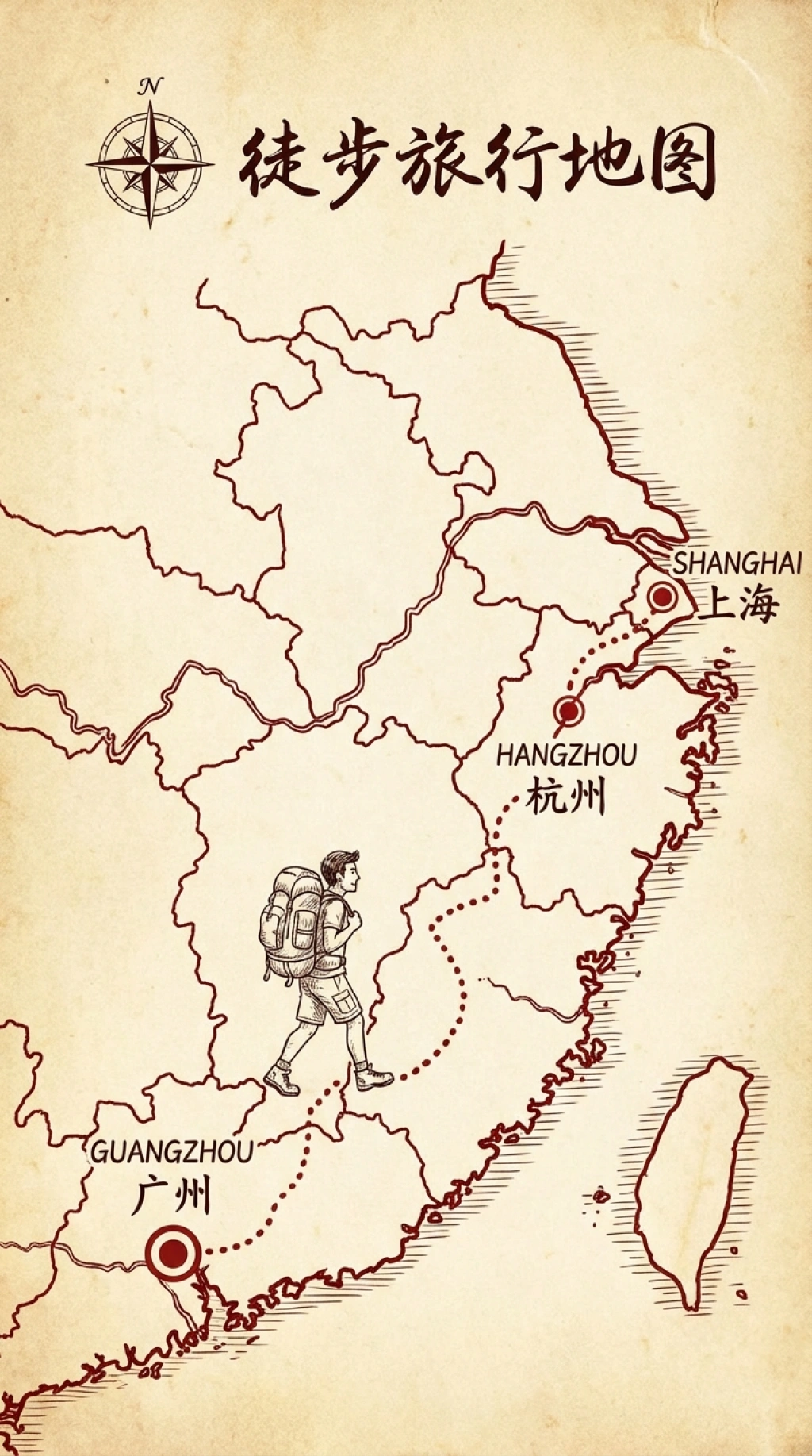 提示词(Prompt) 生成一张徒步的地图,需要一个男人背着行李,从中国的广州到达上海,中途需要通过杭州 |