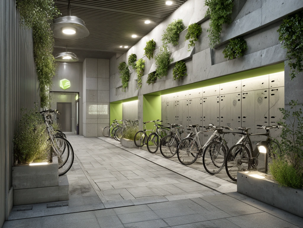 提示词(Prompt) 城市自行车站,简约立面与明亮灯光,绿色与灰白色调,环保现代风格,自行车排列和绿植点缀细致,自然采光与空间明亮,氛围活力,建筑设计效果图 --ar 4:3 |