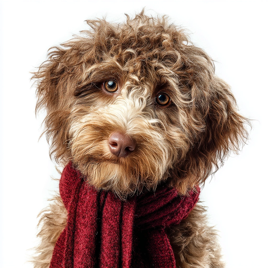 提示词(Prompt) 正面狗狗IP形象,棕色卷毛泰迪,佩戴红色围巾,白色背景,鼻头湿润有光泽,毛发蓬松,眼神温柔,色彩饱和度高 |