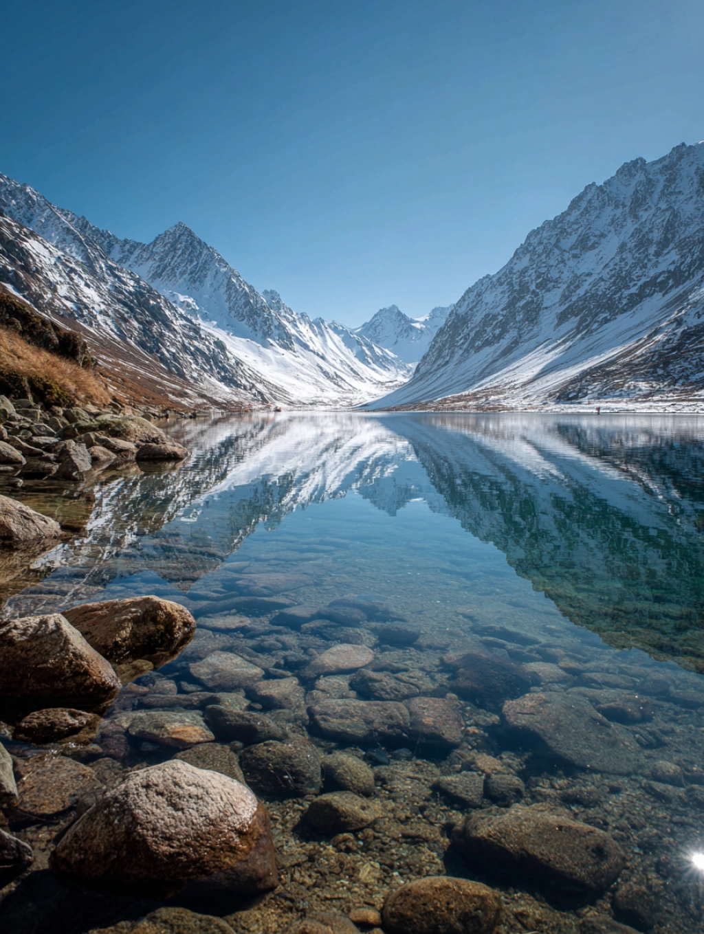 提示词(Prompt) 清澈的湖泊,雪山环绕,水中倒影,平静纯净的自然 --ar 3:4 |