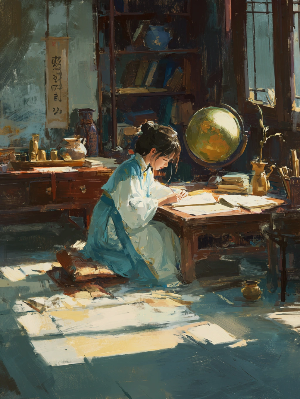 提示词(Prompt) 二次元图书馆午后,少女静坐读书,浅棕与湖蓝,文艺清新风格,书页细节丰富,窗外阳光洒落书桌,画面安静美好 --ar 3:4 |