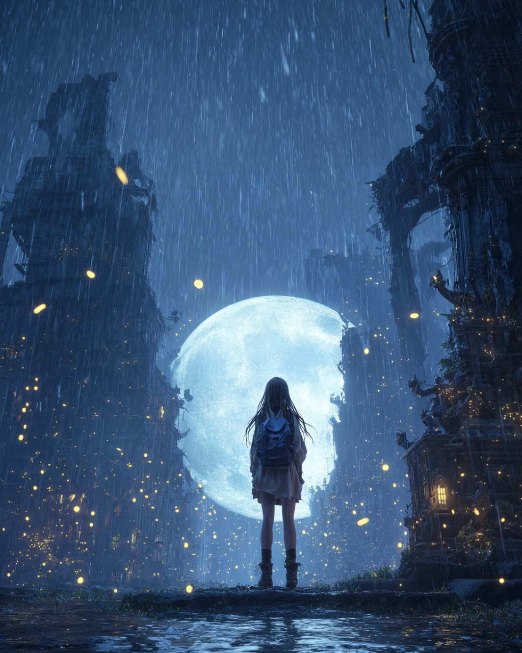 提示词(Prompt) 满月照亮了空灵的夜色,大雨倾盆而下。一个留着长发的女孩背着背包,背对着观众站着。她周围是超现实的、设计复杂的黑暗结构,以及雨中漂浮的发光萤火虫,呈现出超现实的奇幻艺术风格。 --ar 583:728 |