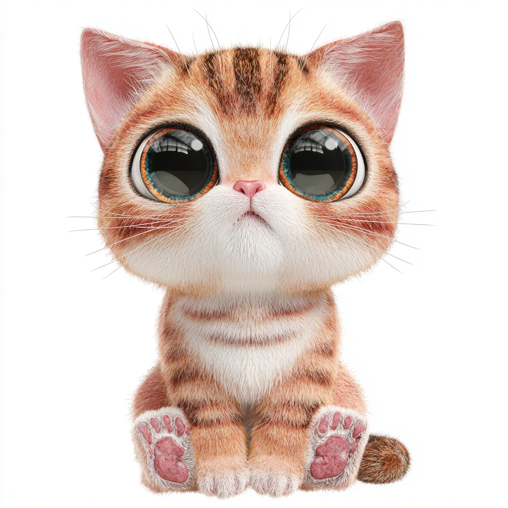 提示词(Prompt) 正面猫咪IP形象,大眼睛短毛,橙色与白色相间,白色背景,胡须清晰,耳朵内粉色,脚掌肉垫细节突出,整体Q萌治愈 |