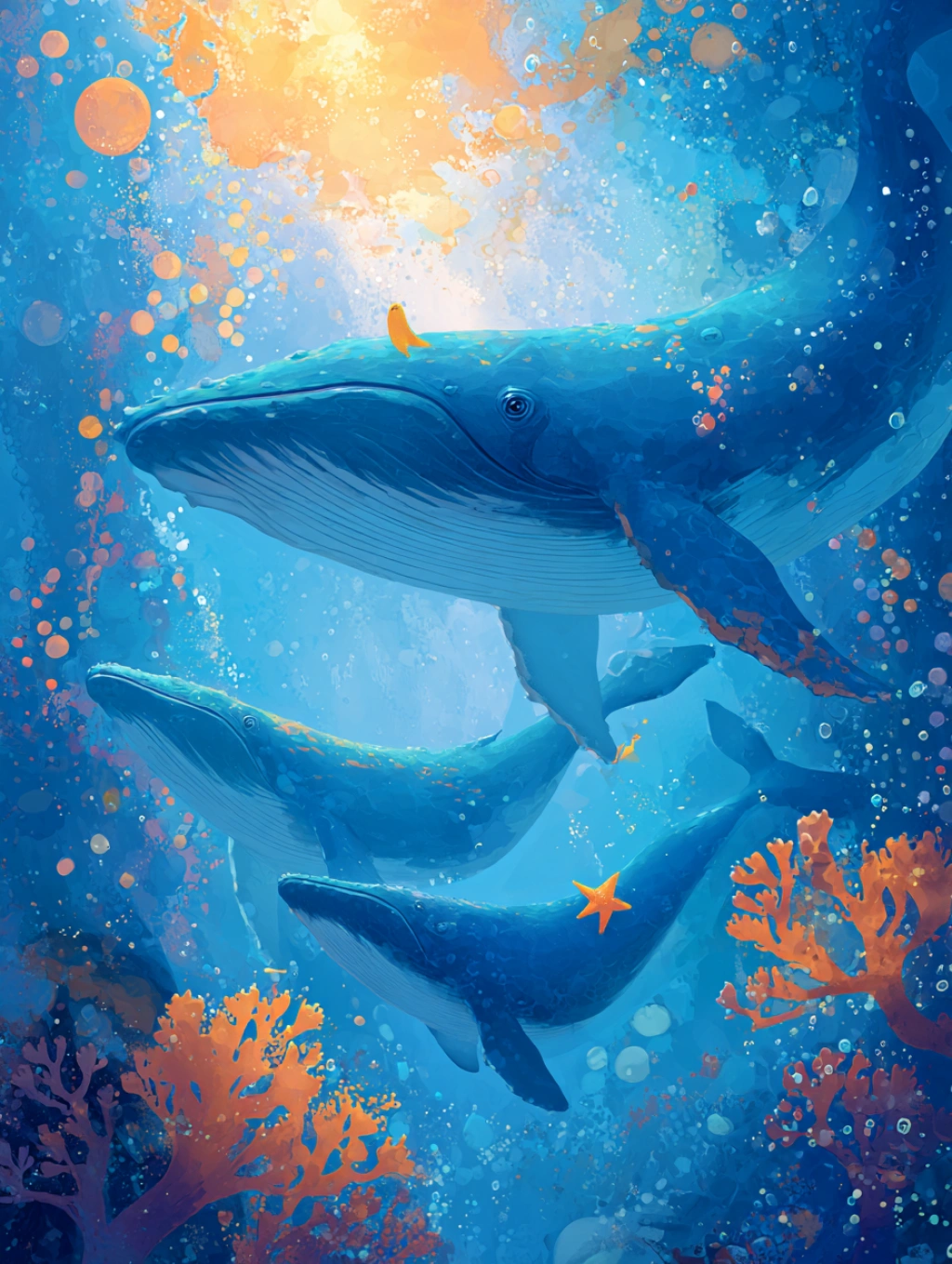 提示词(Prompt) 卡通海底世界,鲸鱼与海星共舞,湛蓝与珊瑚橙,海洋童趣风格,海底泡泡细节,阳光穿透水面,画面清新灵动 --ar 3:4 |
