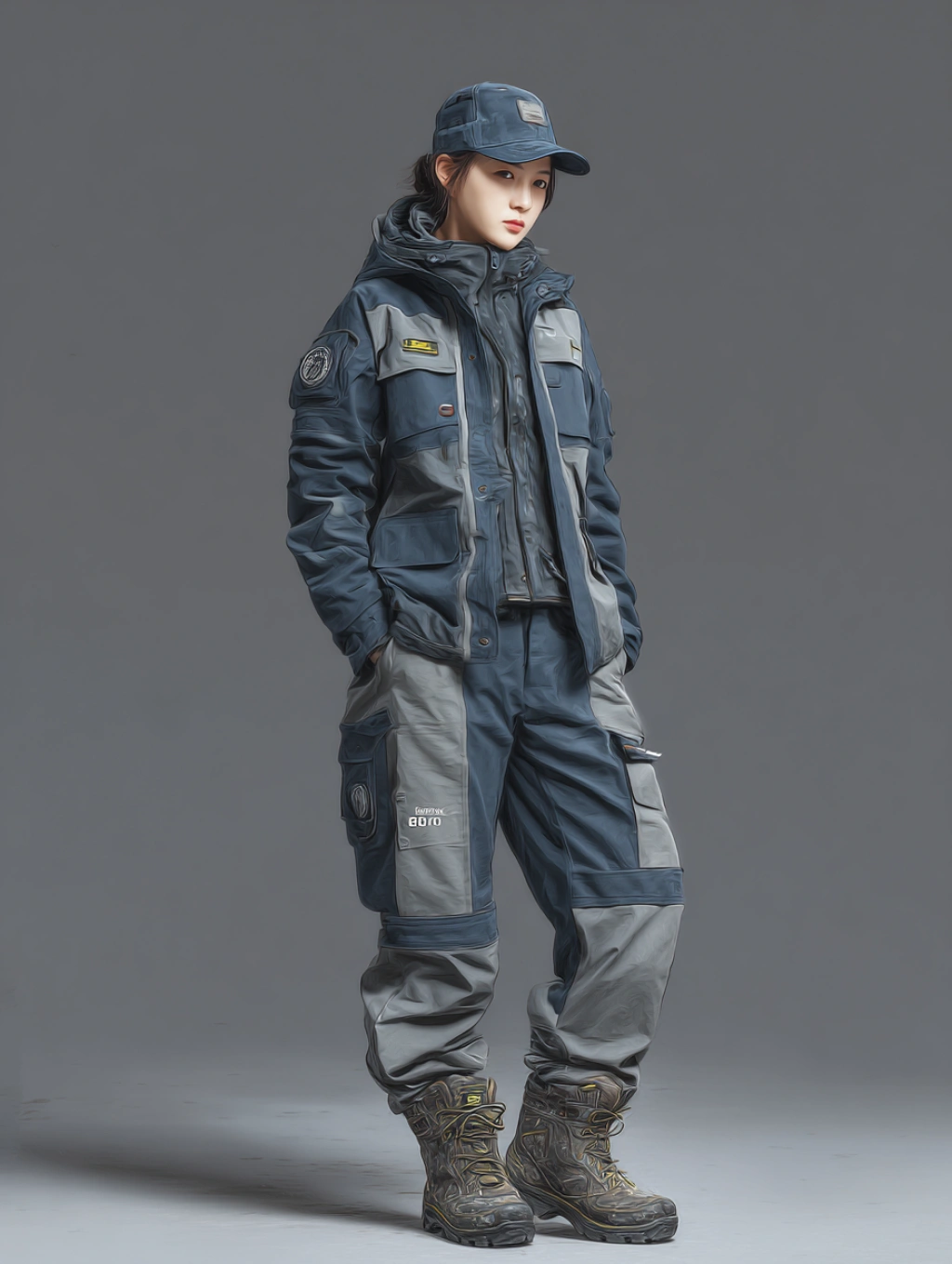 提示词(Prompt) 冬季户外巡查,女士加厚保暖工装与防寒靴,藏青与灰色调,耐寒工装风格,工装帽子与靴子防滑细节,寒冬阳光下衣物厚实,服饰设计效果图 --ar 3:4 |