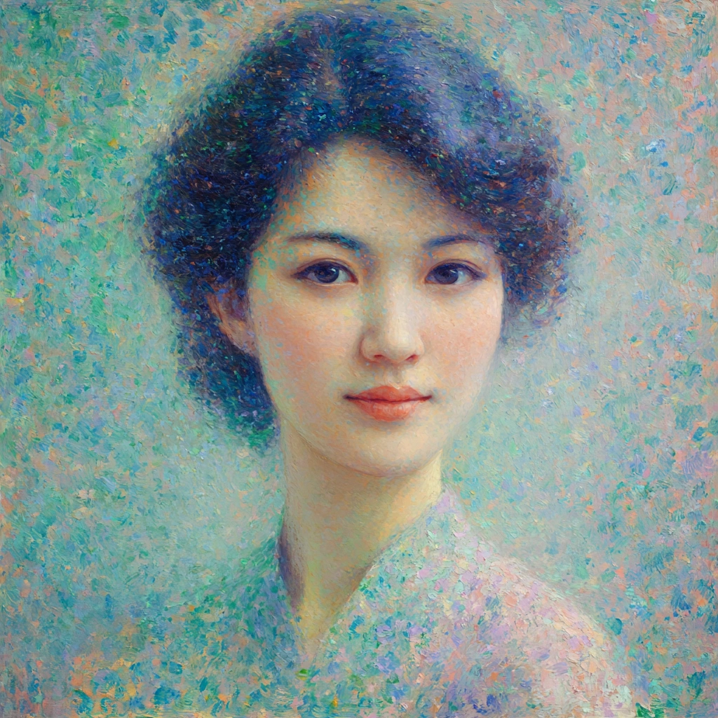 提示词(Prompt) 莫奈印象派风:年轻东方女性,柔化五官轮廓,破碎彩点描绘光色,粉蓝绿淡雅调,自然脸部光反射,空气迷蒙 |