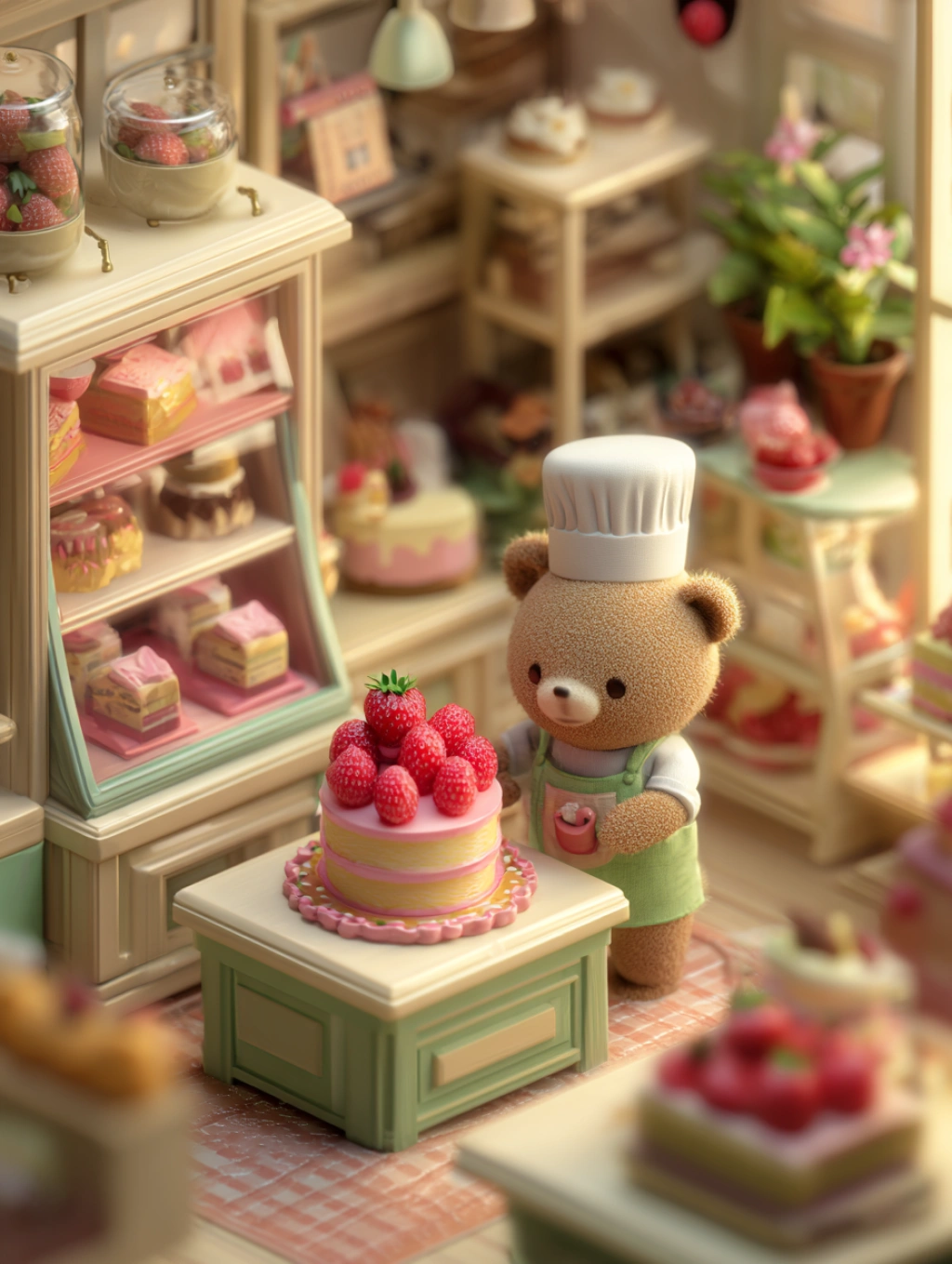 提示词(Prompt) 卡通甜品店,小熊店主端出蛋糕,粉红与奶油黄,Q萌童趣风格,蛋糕有草莓装饰,店内暖光映射甜品,画面可爱诱人 --ar 3:4 |