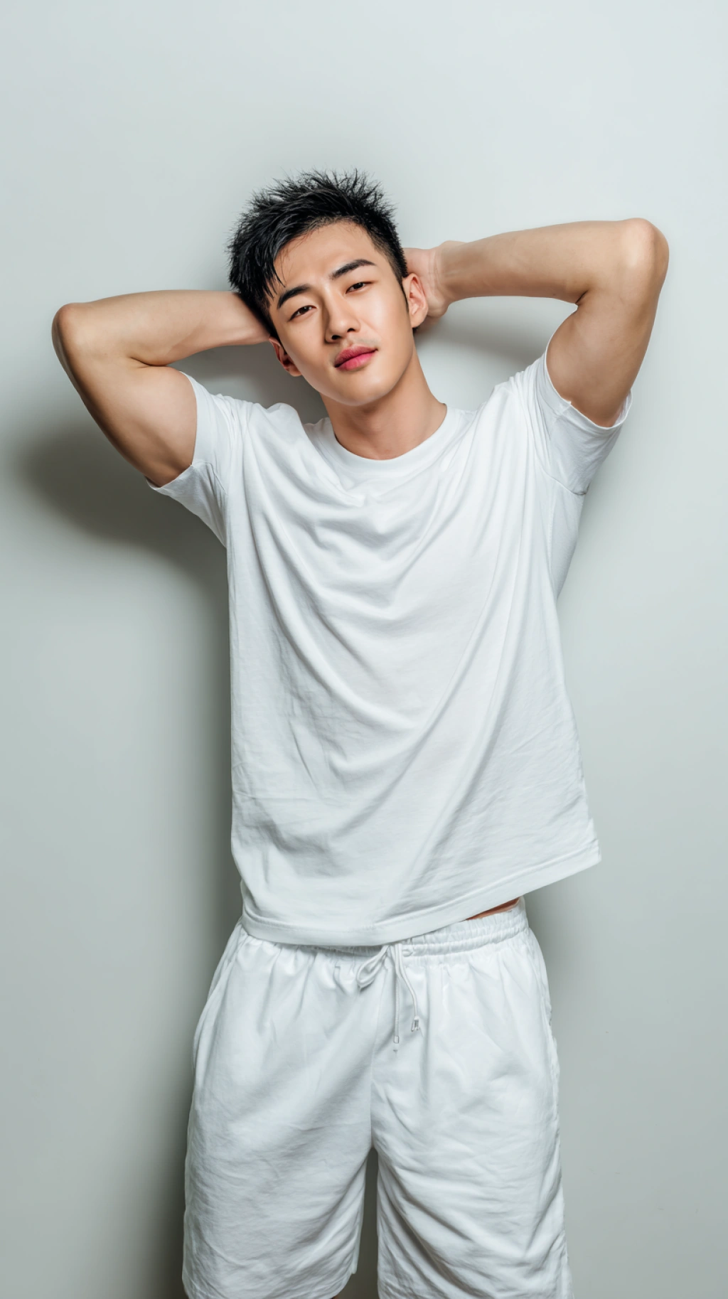 提示词(Prompt) 亚洲 男时装模特站立,穿着纯白短T恤和白色短裤,姿势休闲,双手在外面放松,中性灰色背景,全身丰满,极简主义工作室灯光 --ar 9:16 --c 20 |