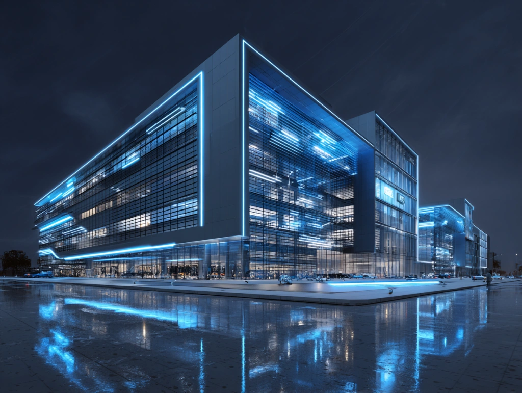 提示词(Prompt) 高科技研发中心,玻璃与金属外墙搭配智能设备,银白与深蓝色调,未来感风格,LED灯带和智能门禁突出细节,夜晚灯光映射建筑立面,科技氛围浓厚,建筑设计效果图 --ar 4:3 |