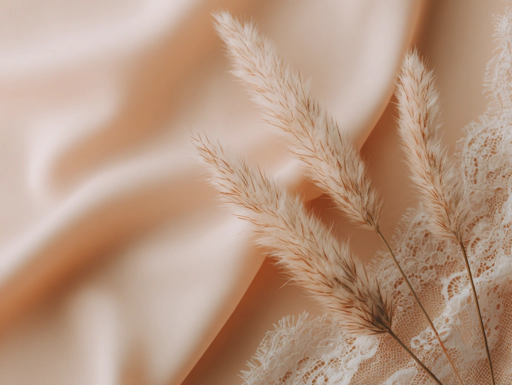 柔软的米色背景上,搭配一个精致的小干潘帕斯草和一块蕾丝面料,柔和的灯光营造出温暖优雅的氛围,极简风格,高细节,专业的产品摄影 --ar 4:3 --c 20