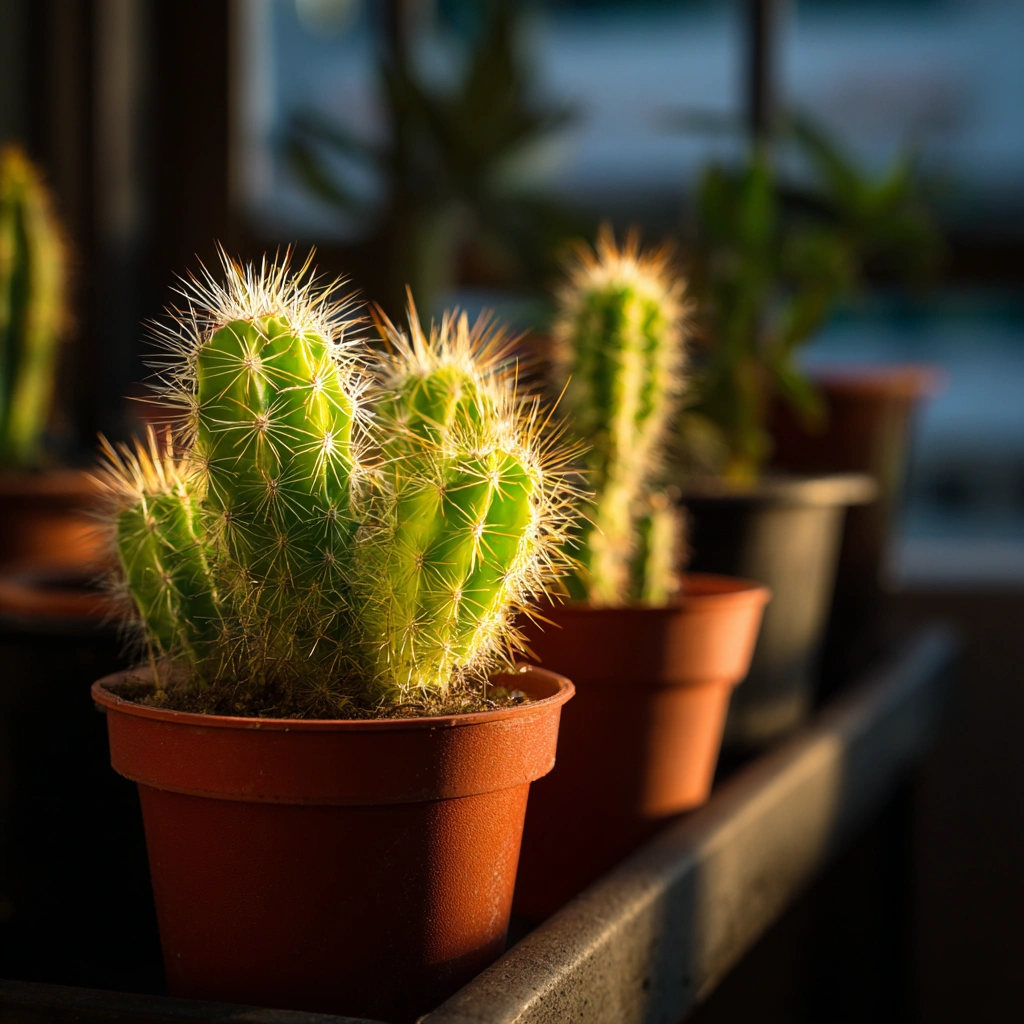 提示词(Prompt) 阳台小盆栽,仙人掌刺座特写,鲜绿与淡黄色调,高清植物摄影风格,刺座排列细致,阳光斜射形成强烈明暗对比,画面简约现代 |