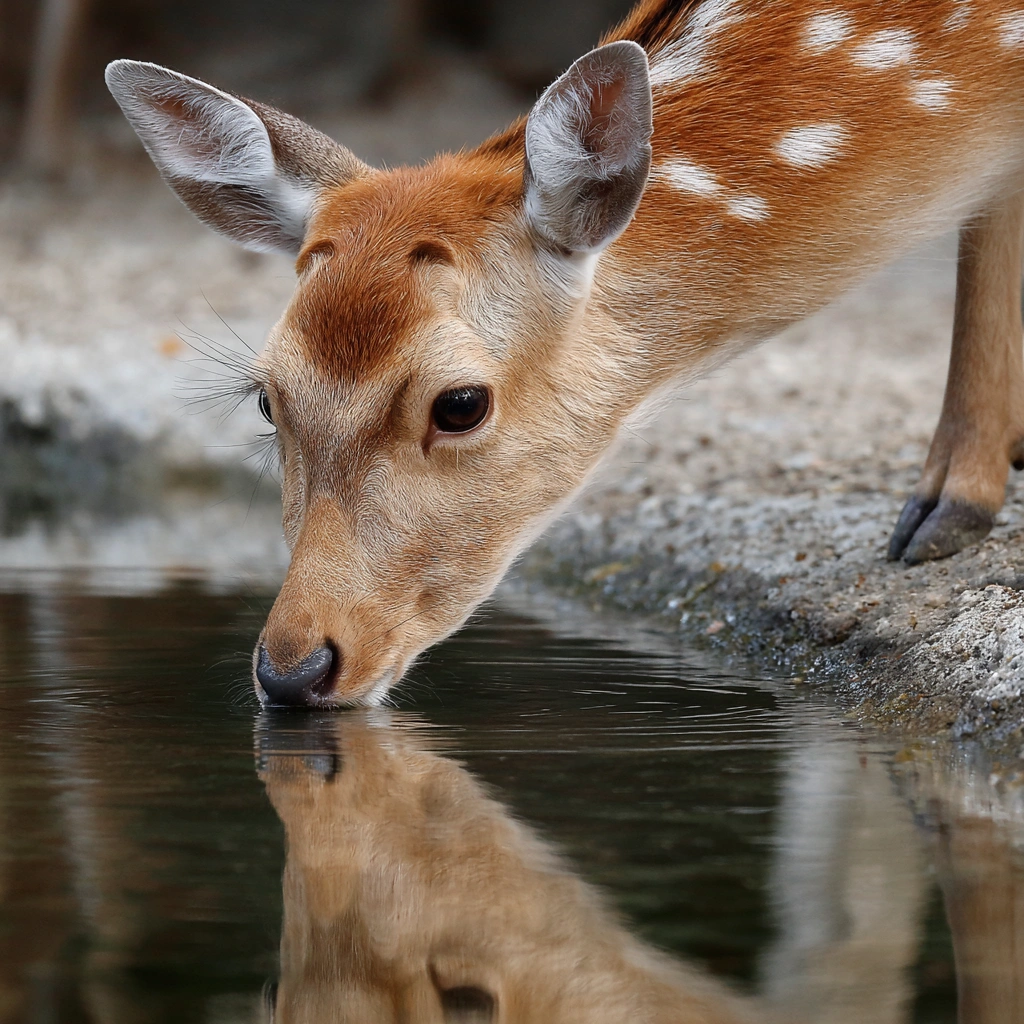 提示词(Prompt) 溪边倒影,梅花鹿低头饮水特写,浅棕毛皮与白色斑点,高清自然特写风格,睫毛与斑点清晰可见,水面映射鹿脸,氛围和谐安详 |