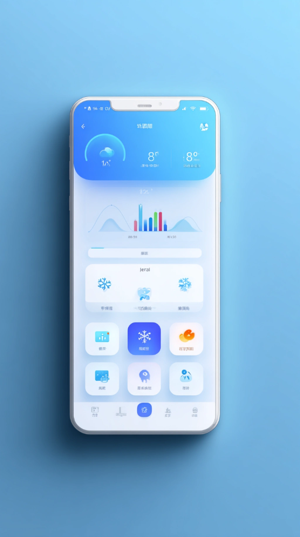 提示词(Prompt) 手机应用主界面设计,圆角卡片与悬浮按钮,蓝白色为主色调,极简现代风格,图标细节精致,顶部状态栏有柔和渐变光影,整体界面清爽整洁 --ar 9:16 |