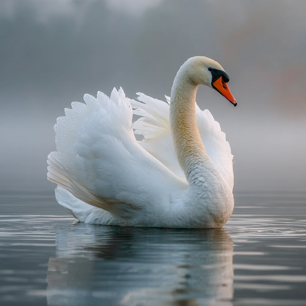 提示词(Prompt) 湖面晨雾,白天鹅伸展羽翼,纯白羽毛与橙黄喙部,高清唯美摄影特写风格,羽毛有晨露闪光,逆光下水面倒影清晰,画面优雅静谧 |