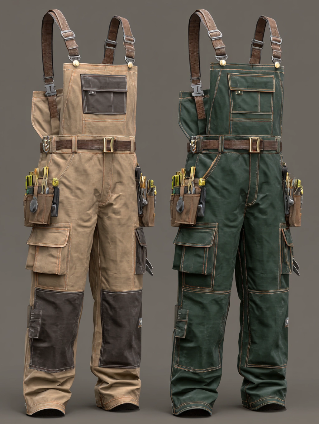 提示词(Prompt) 春季园艺工作,男士帆布工作服与工具腰带,卡其与深绿色调,功能性工装风格,工作服口袋与腰带工具细节,阳光照射衣物厚实质地,服饰设计效果图 --ar 3:4 |