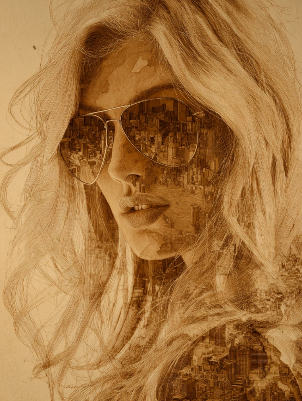 提示词(Prompt) 宣纸上的Inkplash艺术、棕褐色、指甲花、剪影艺术、宏伟、水墨双曝光、清晰的线条、大坂城市景观下方和令人惊叹的日本女性特写肖像的侧面,金发蓬松,镜面红色飞行员太阳镜 --ar 3:4 |