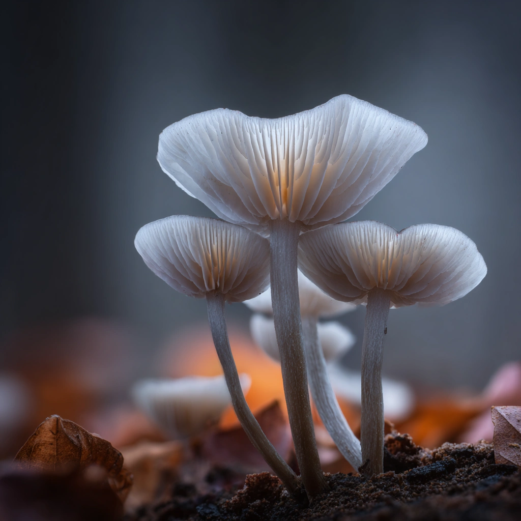 提示词(Prompt) 森林落叶间,蕈类蘑菇特写,米白与浅灰色调,高清微距摄影风格,菌伞纹理细腻,湿润泥土与微光交错,画面神秘清新 |