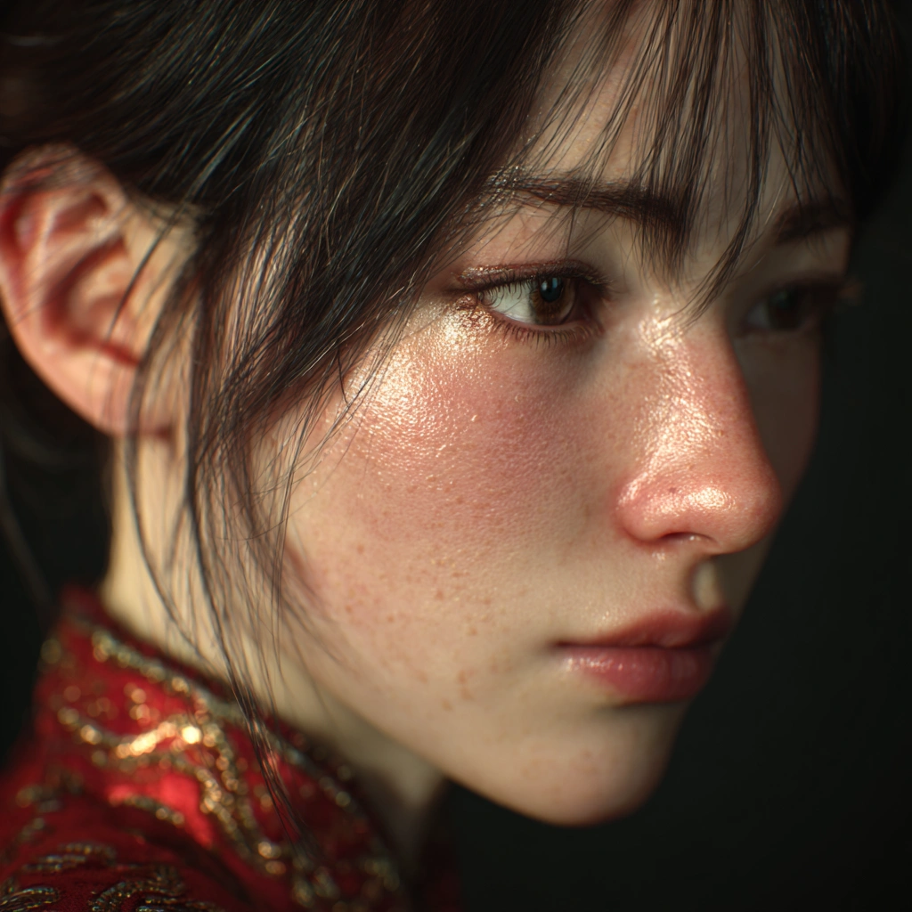 超真实3D渲染:年轻东方女性,PBR皮肤微光+细腻毛孔+微血丝,半透明耳廓,精致鼻梁,自然唇纹,头发单根粒度与轻微飞丝,全局光照与体积光,高分辨率