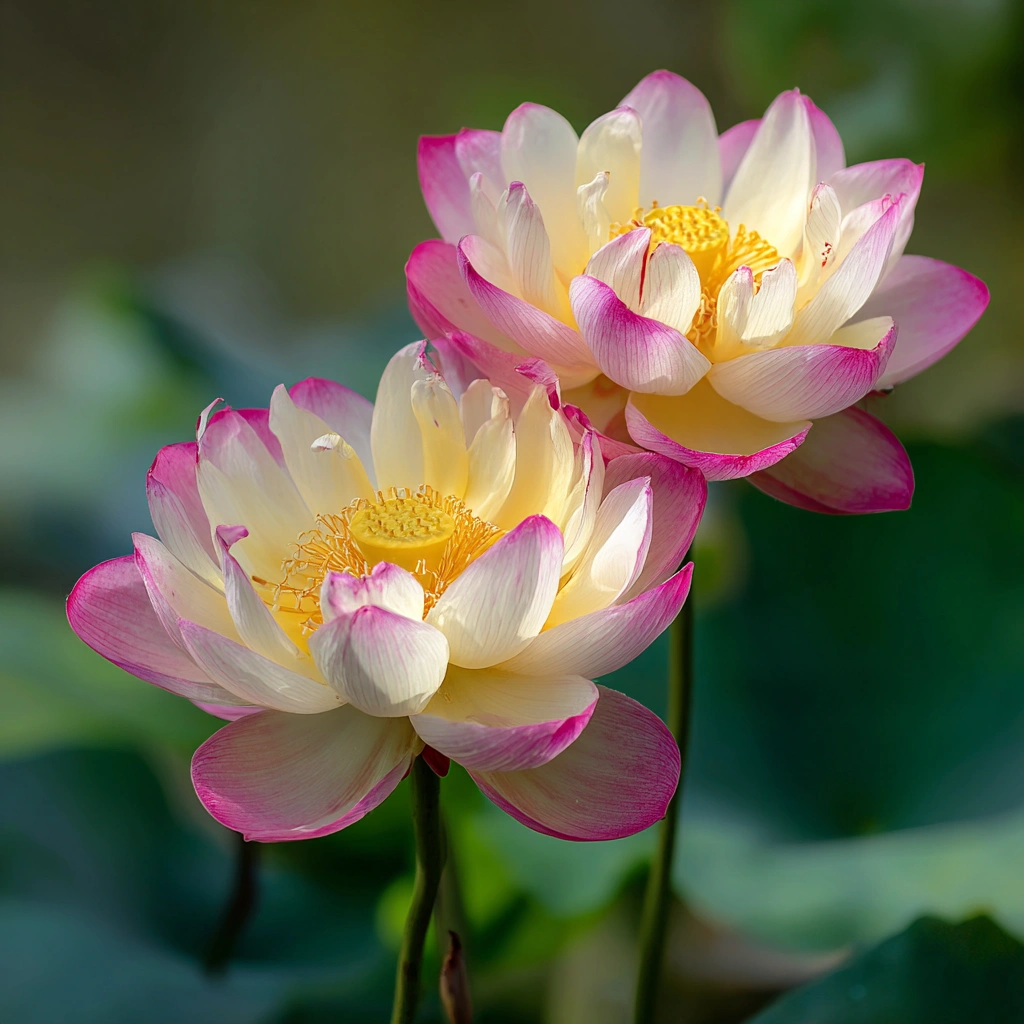 提示词(Prompt) 夏日荷塘边,荷花盛开特写,粉白与嫩黄配色,高清唯美摄影风格,花蕊细节清晰,荷叶倒影水面,阳光洒落花瓣,画面清新灵动 |