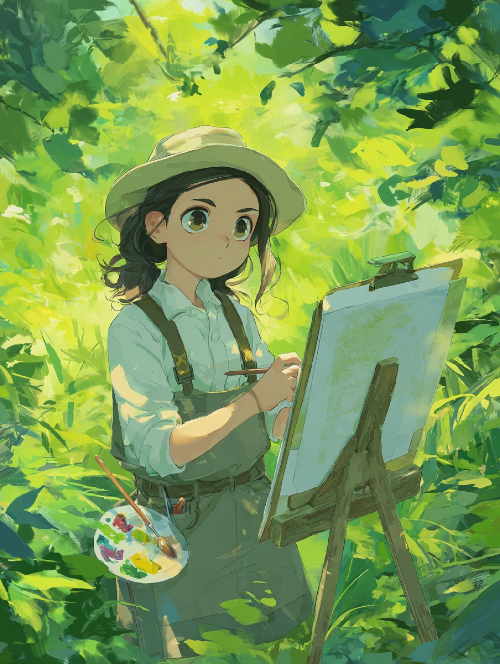 提示词(Prompt) 二次元春游森林,少女背着画板写生,浅绿与米白,艺术清新风格,画板上色彩斑斓,晨光透过树叶,画面治愈安静 --ar 3:4 |