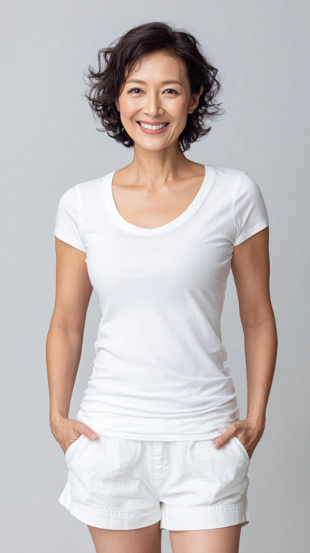 提示词(Prompt) 亚洲 45岁的女装模特站立,穿着纯白短T恤和白色短裤,姿势休闲,双手在外面放松,中性灰色背景,全身丰满,极简主义工作室灯光 ---ar 9:16 --c 20 |