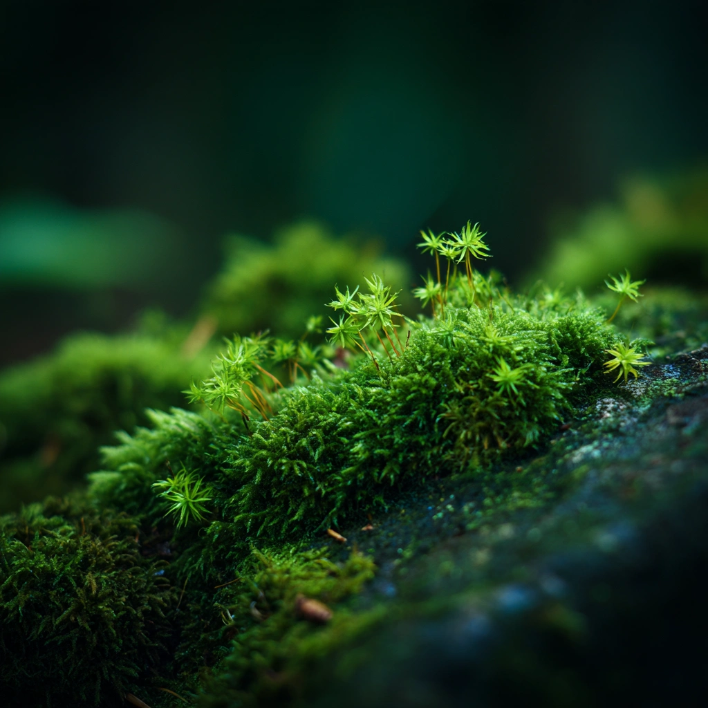 提示词(Prompt) 森林苔藓石上,苔藓绒毛特写,墨绿与翠绿色彩,高清微距摄影风格,绒毛细节丰富,微光映射苔藓表面,画面静谧生机 |