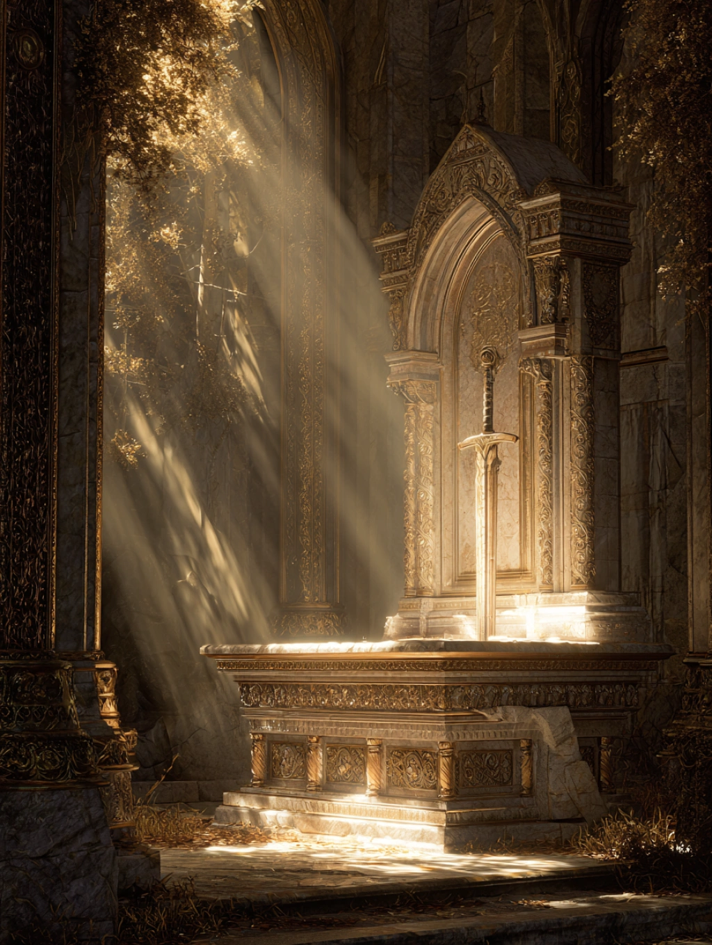 提示词(Prompt) 游戏远古祭坛,圣骑士举剑祈祷,金色与石灰,史诗奇幻风格,祭坛雕刻细腻,晨曦洒落圣光,氛围庄严神圣 --ar 3:4 |
