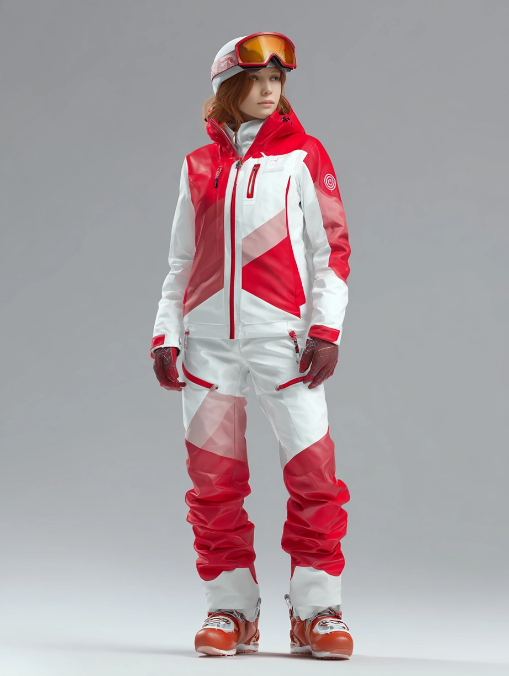 提示词(Prompt) 冬季滑雪场,女士防风冲锋衣与保暖裤,红白双色,专业户外运动风格,衣物防水拉链与帽檐设计,雪地反射阳光,服饰设计效果图 --ar 3:4 |
