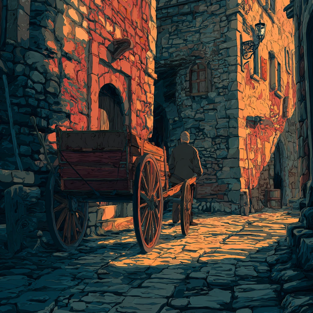 提示词(Prompt) 古镇街道手绘,老人推着木车穿行石板路,灰褐与深红主色调,复古手绘风格,街道砖石质感丰富,木车轮廓清晰,夕阳余晖投射长长影子 |