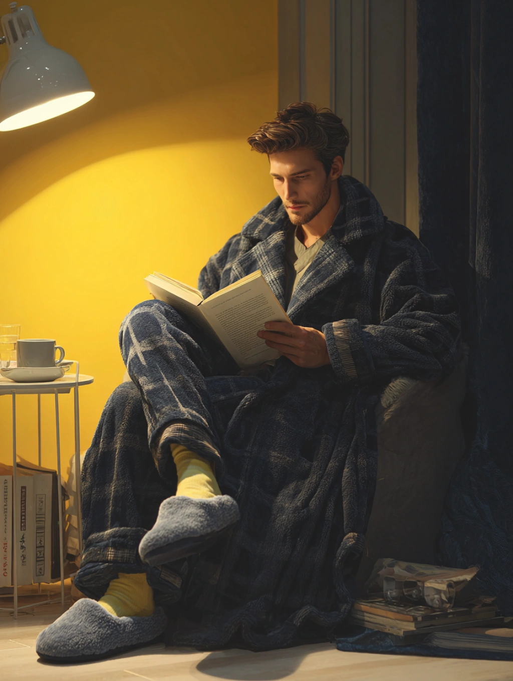 提示词(Prompt) 秋季夜晚阅读,男士法兰绒睡袍与厚棉拖鞋,深灰与藏蓝色,温暖家居风格,睡袍腰带与袖口设计突出,暖黄台灯光下衣物层次分明,服饰设计效果图 --ar 3:4 |