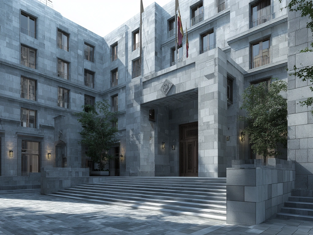 市政办公楼,对称立面与石材墙体搭配广场台阶,灰白与深蓝色调,庄重大气风格,旗帜飘扬和雕塑装饰细致,清晨阳光投射长影,气质严谨,建筑设计效果图 --ar 4:3