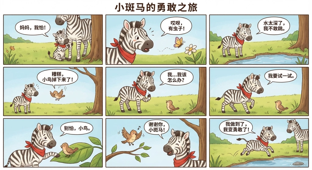 提示词(Prompt) 帮我生成一个9页的连环画,给6岁的小朋友讲故事用,用中文标出简短对话,主角是小斑马,讲的是小斑马慢慢变勇敢的故事,需要多角度展现主角,保持主角的一致性。 |