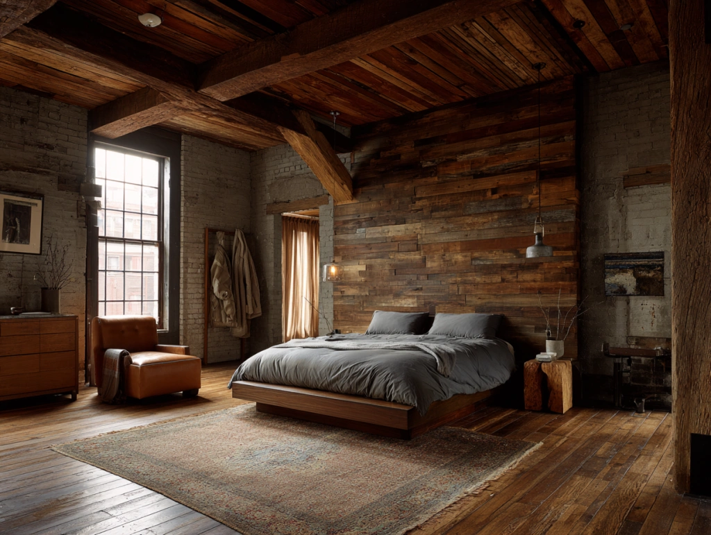 原木风格 卧室, 中间空着,周边摆放几件简约的家具, 营造出温馨舒适的氛围。 --ar 4:3
