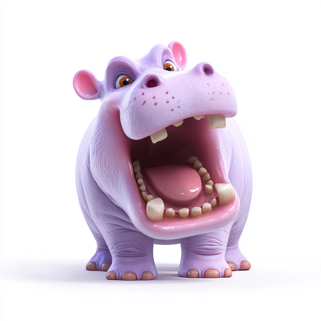 提示词(Prompt) 白色背景,正面卡通河马IP形象,浅紫色皮肤,大嘴微笑,牙齿突出,脚掌圆润,耳朵粉色,眼睛闪亮,色彩可爱 |