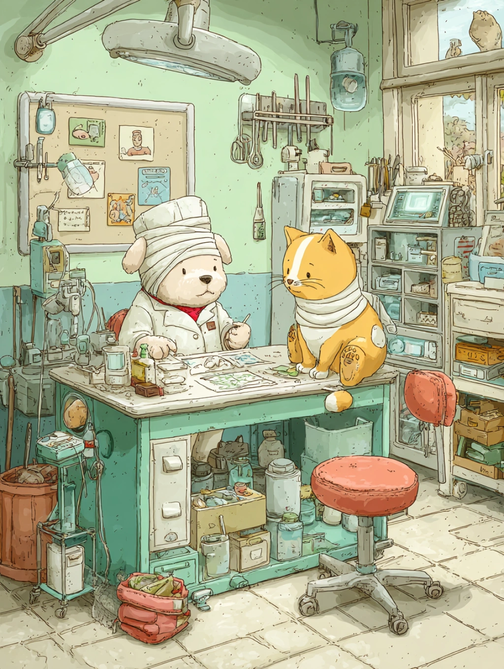 提示词(Prompt) 卡通宠物医院,小狗医生为猫咪包扎,淡绿与粉橙,童趣治愈风格,医疗工具细节丰富,室内明亮光线,画面温馨可爱 --ar 3:4 |