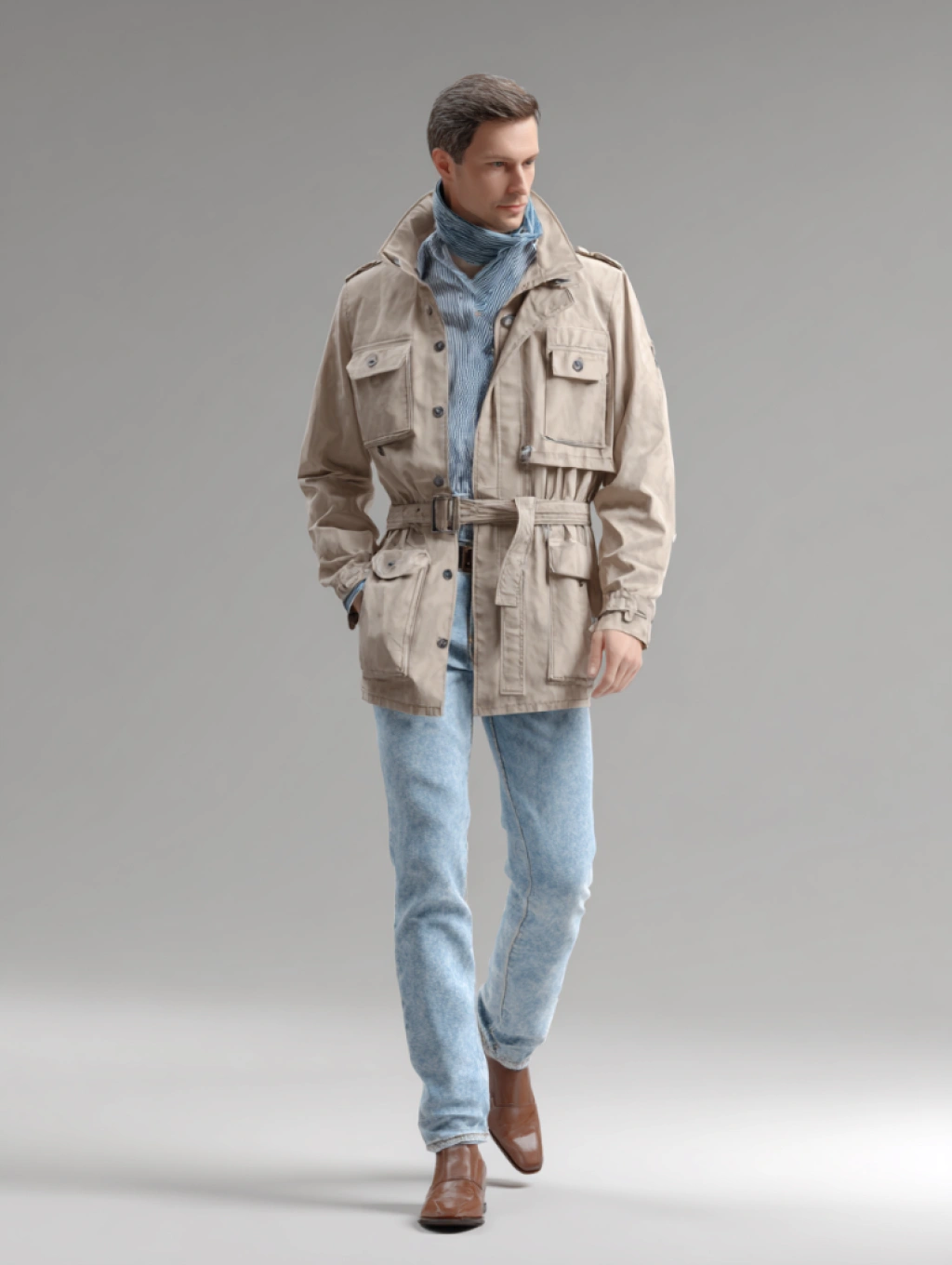 提示词(Prompt) 春季花园散步,男士米色风衣搭配淡蓝牛仔裤,浅色系,休闲绅士风格,风衣腰带与口袋设计突出,春日阳光下衣物质地清晰,服饰设计效果图 --ar 3:4 |