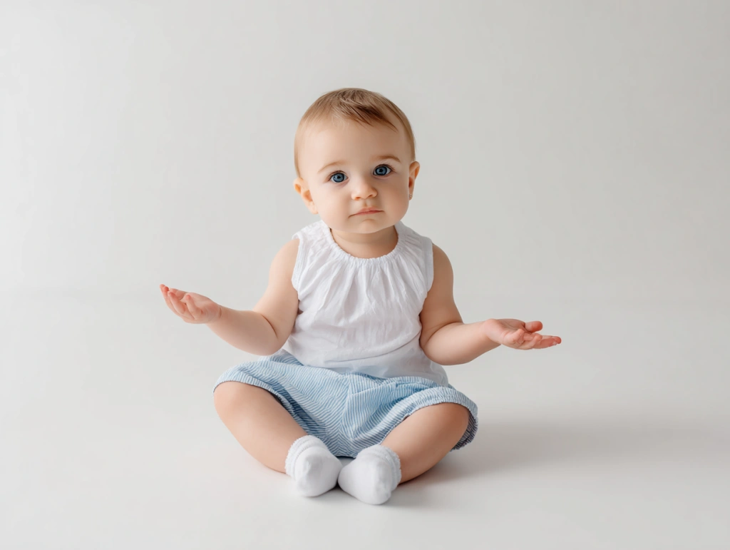 提示词(Prompt) 婴儿坐在纯白背景上,穿着带有可爱白色无袖上衣,浅蓝色短裤,白色袜子,张开双手,工作室摄影风格简单干净,灯光柔和,极简构图。 --ar 4:3 |