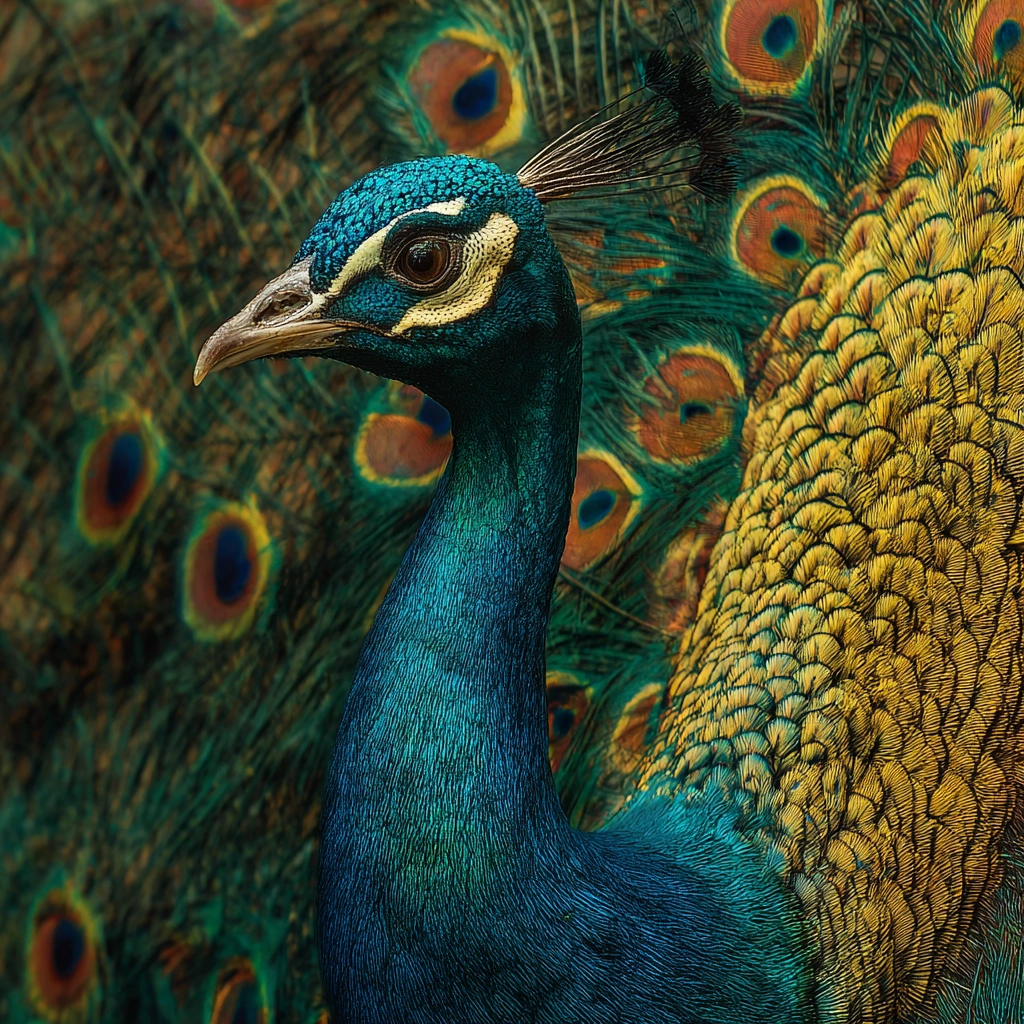 提示词(Prompt) 热带花园,孔雀开屏特写,蓝绿羽毛与金色眼斑,高清唯美动物摄影风格,羽毛图案繁复细致,阳光斑斓照射羽翼,画面绚丽壮观 |