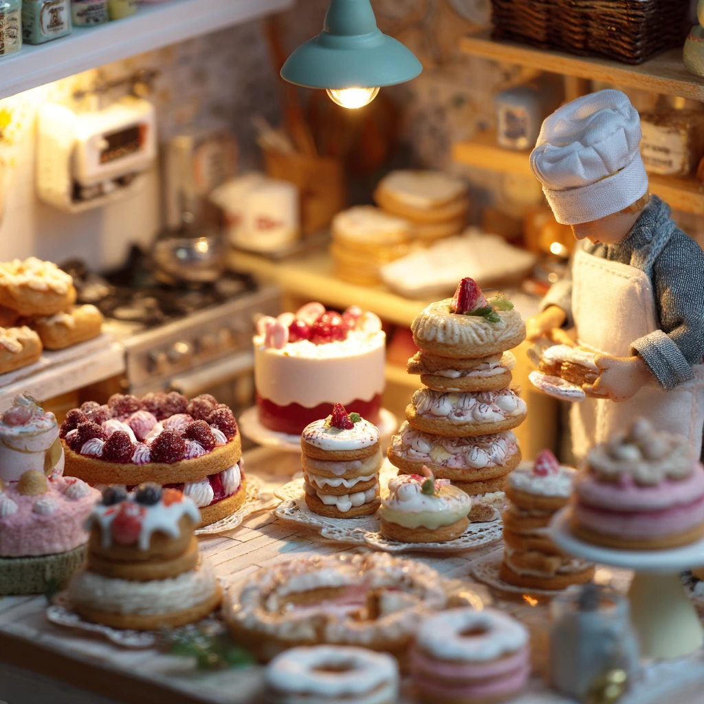 提示词(Prompt) 手工烘焙厨房,烘焙师装饰曲奇和蛋糕,奶油白与莓果红色彩,温暖家庭风格,饼干造型多样,糖霜细节清晰,厨房灯光柔和照亮甜点 |